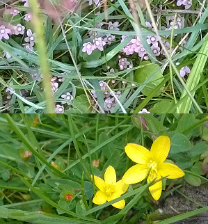 Our main recording effort was made on the northern, wetter part of the Tilmire which had only recently been vacated by its important ground-nesting birds. After a record-breaking wet June we were rather surprised by the dryness of the area, all maintaining dry feet and encountering little standing water. The highlights here were probably Marsh Cinquefoil (Comarum palustre) and Bogbean (Menyanthes trifoliata), the leaves of which were abundant in some areas, and a single patch of flowering Bog Pimpernel (Anagallis tenella – above,top). The unusual (for vc61) acidic environment also provided us with some interesting grasses - Mat-grass (Nardus stricta), Purple Moor-grass (Molinia caerulea), Heath-grass (Danthonia decumbens) and sedges - Star Sedge (Carex echinata), Flea Sedge (C. pulicaris). We also encountered interesting plants on the surrounding higher land, which included a golf course - Greater Burnet-saxifrage (Pimpinella major), Heath Groundsel (Senecio sylvaticus), Climbing Corydalis (Ceratocapnos claviculata) and Trailing St John's-wort (Hypericum humifusum – above bottom).